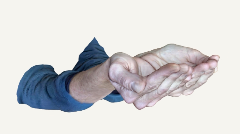 The sculpture began with a physical gesture: a 3D scan of real hands. These hands were then reconstructed and refined in digital modeling, becoming the structural base of the piece.